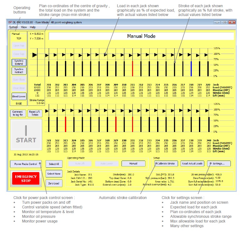 Typical layout of jacks, power packs and control computer, and typical DL-P40 control screen with 40 jack system: